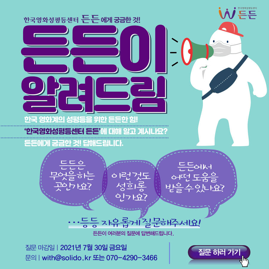 '든든'이라는 이름이 생소한 분들을 위해 '든든이 알려드림' 캠페인을 진행합니다. '든든은 무엇을 하는 곳인가요?' 같은 간단한 질문부터, '이런 것도 성희롱인가요?' '든든에서 어떤 도움을 받을 수 있나요?' 등 일상의 고민까지 든든에게 궁금한 점을 자유롭게 나눠주세요!