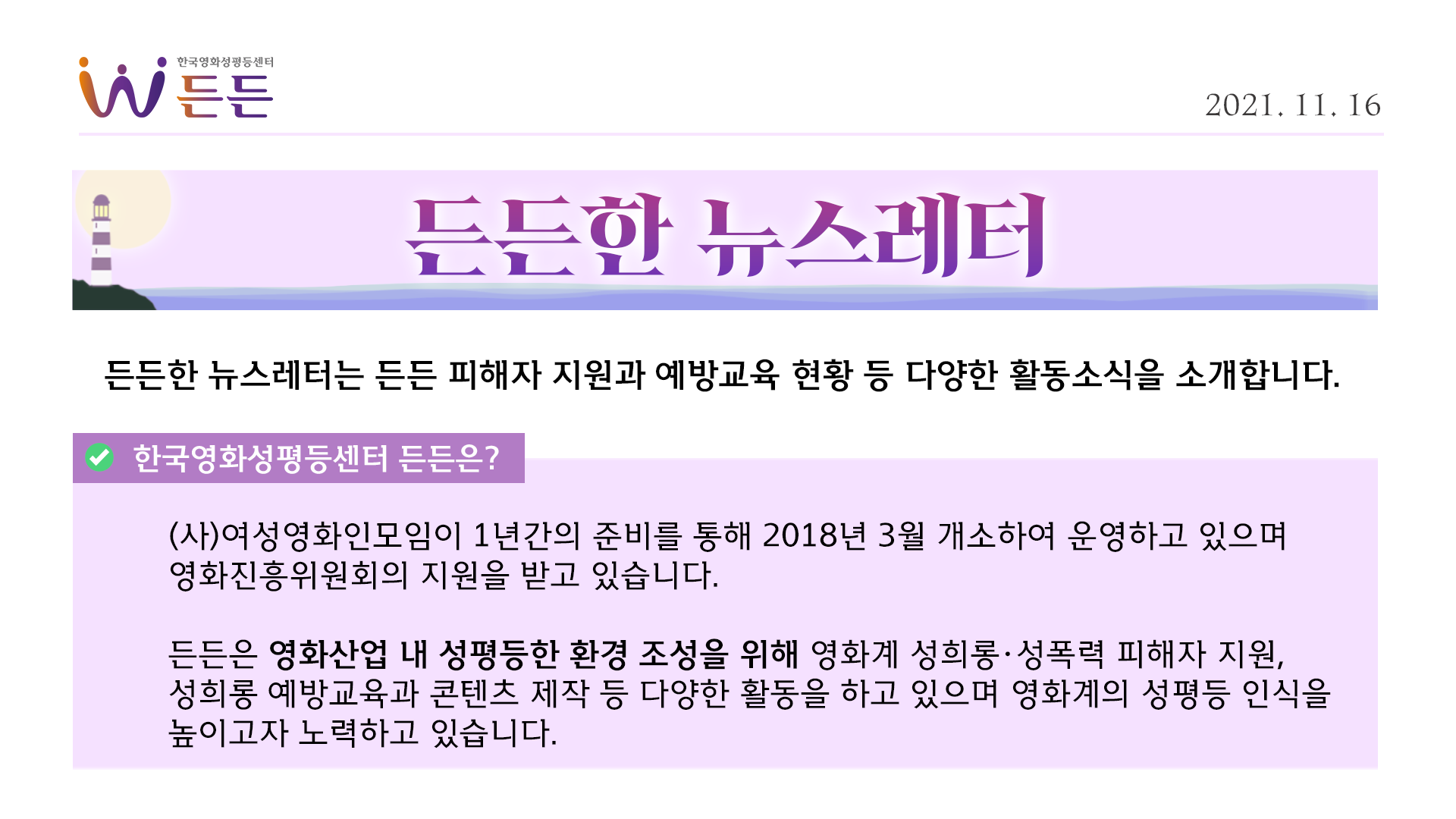 한국영화성평등센터 든든은 2018년부터 영화산업 내 성희롱 예방교육 강사를