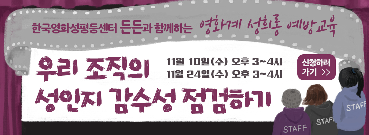 한국영화성평등센터 든든은 영화계 성평등과 성희롱 예방을 위해 매달 ‘영화계 성희롱 예방교육’ 공개강좌를 진행하고 있습니다.